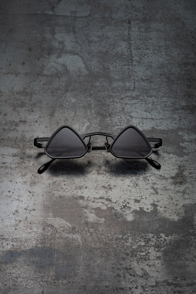 These edgy, straightforward frames showcase a unique reversed pyramid shape with smoothed angles. The nose bridge is subtly curved and extended, with nose pads positioned centrally, all crafted from premium titanium.